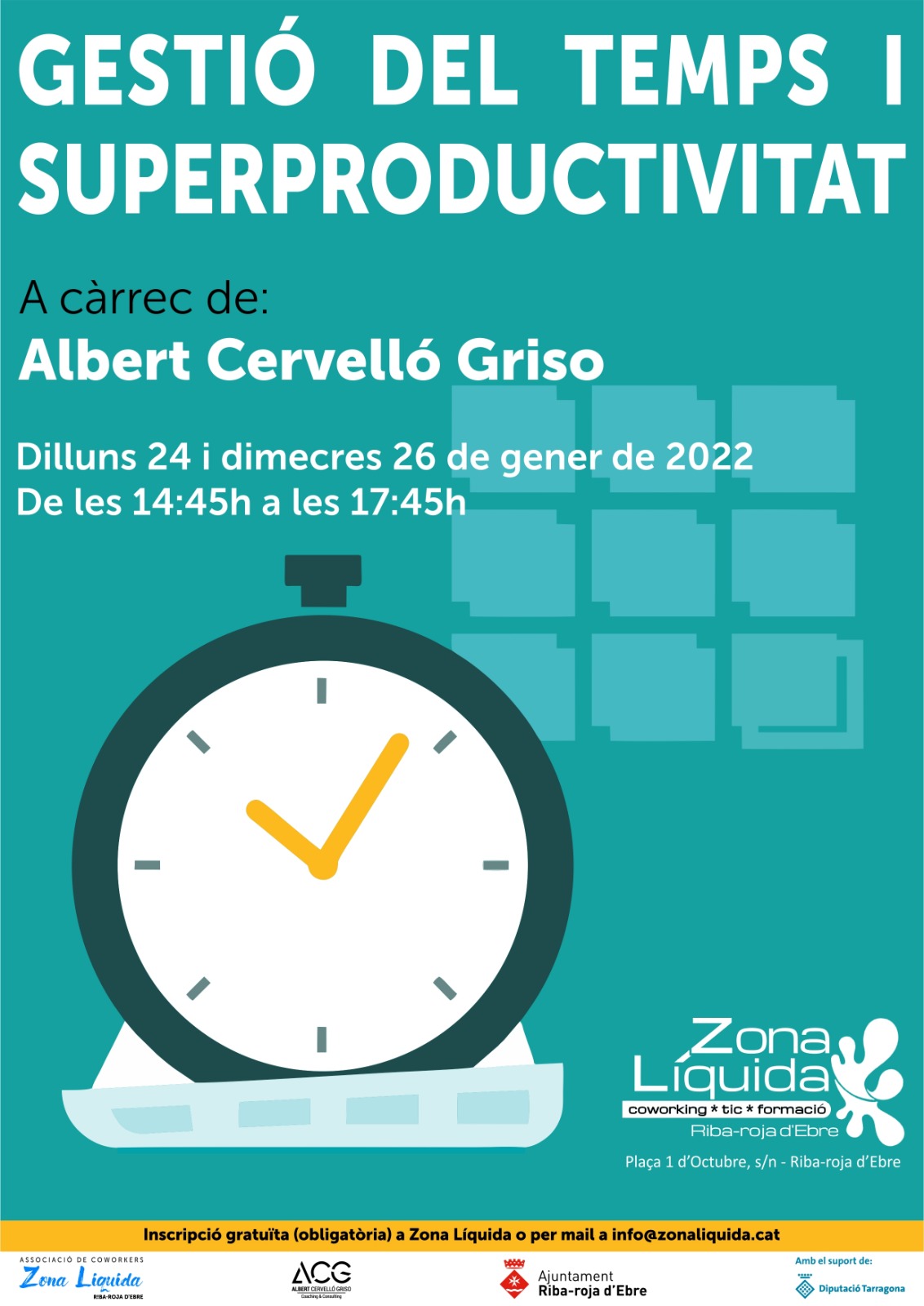 L’Associació de Coworkers de Riba-roja d’Ebre organitza els dies 24 i 26 de gener un taller formatiu sobre ‘Gestió del temps i superproductivitat’, a càrrec d’Albert Cervelló Griso.
